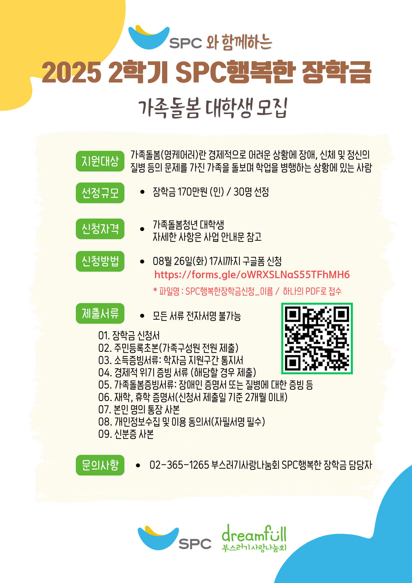 2025년 2학기 SPC그룹과 함께하는 『행복한 장학금-가족돌봄대학생』을 모집합니다.